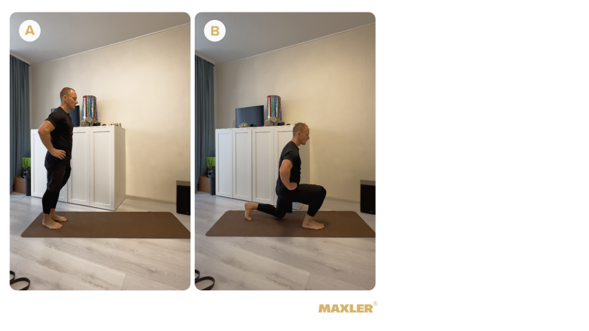 - Техника выполнения: Встаньте прямо, ноги на ширине плеч. Сделайте широкий шаг назад одной ногой. Опуститесь вниз, сгибая обе ноги в коленях примерно до 90 градусов. Колено передней ноги не должно выходить за носок, колено задней ноги касается пола. Спина прямая. Руки на поясе. Оттолкнитесь передней ногой, возвращаясь в исходное положение. Повторите для другой ноги.