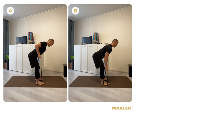 - Техника выполнения: Встаньте, ноги на ширине плеч, слегка согнуты в коленях. Наклоните корпус вперед, сохраняя прямую спину (угол примерно 45-60 градусов к полу). Возьмите гантели (резину) в обе руки. На выдохе потяните гантели (резину) к поясу, сводя лопатки. Локти двигается вдоль корпуса. На вдохе медленно опустите гантели (резину). Сделайте подход на одну сторону, затем на другую.