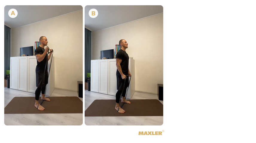- Техника выполнения: Встаньте прямо, ноги на ширине плеч, возьмите гантели, (бутылки или резину) в руки, ладони смотрят вперед. На выдохе согните руки в локтях, поднимая вес к плечам. В верхней точке сожмите бицепс. Локти прижаты к корпусу. На вдохе медленно опустите руки.