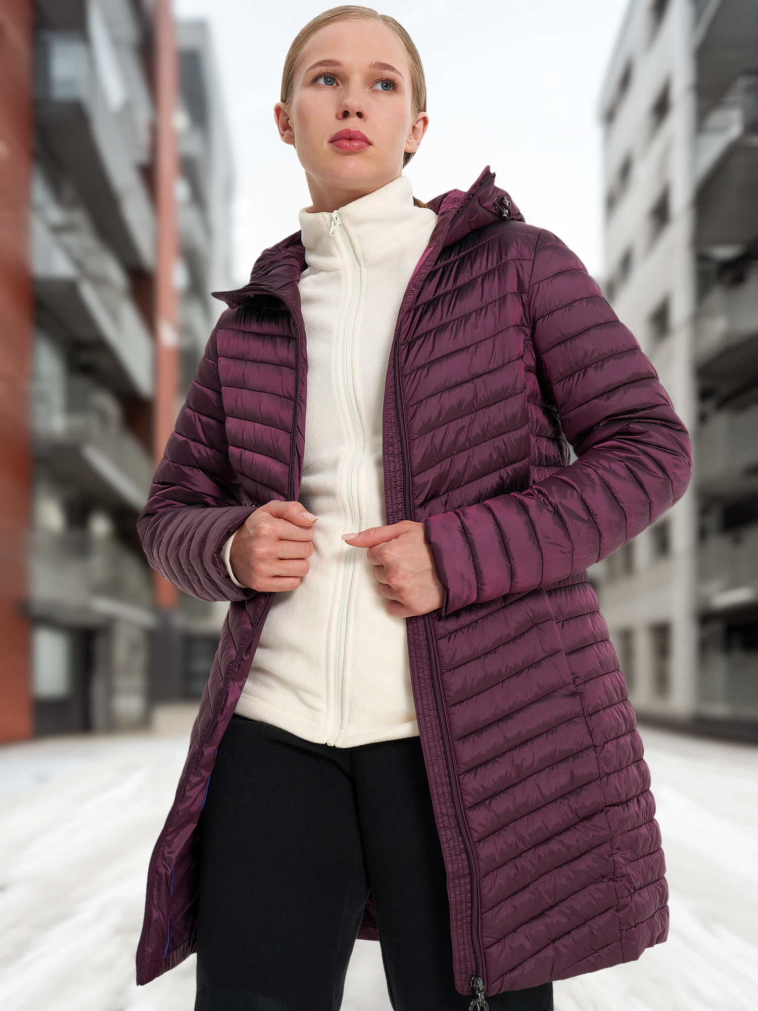 Куртка из нейлона и полиэстера с наполнителем из утиного пуха и пера. Цвет приятный, но длина оказалась неудобной — не короткая и не длинная. Муж пошутил, что в ней я выгляжу так, словно жду ребенка: объемный верх и стройные ноги. Укороченный вариант мог бы подойти для сочетания с юбкой или джинсами, но эту модель мы отвергли. Честно говоря, сложно представить, на какой фигуре этот крой будет смотреться идеально.