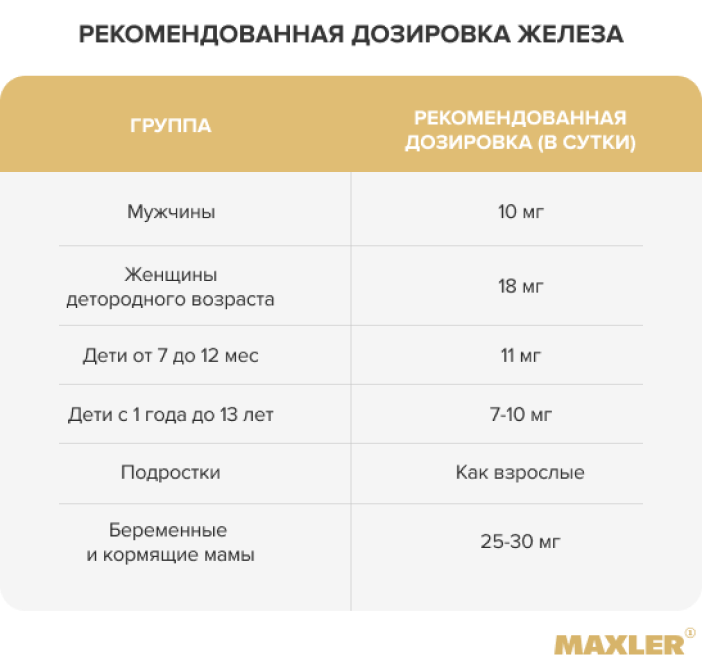 Обычным людям: мужчинам — 10 мг, женщинам детородного возраста — 18 мг. Детям от 7 до 12 мес — 11 мг. Детям с 1 года до 13 лет — 7-10 мг . Подросткам — как взрослым. Беременным и кормящим мамам — 25-30 мг железа.